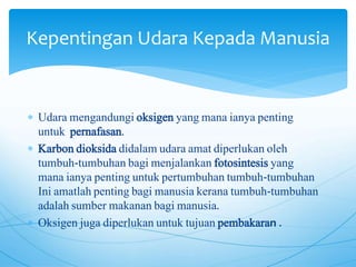 Kepentingan Udara Kepada Manusia. Jelas badan manusia hari ini tidak berfungsi dengan berkesan disebabkan kekurangan. Darah mengangkut oksigen dari peparu ke seluruh bahagian tubuh.